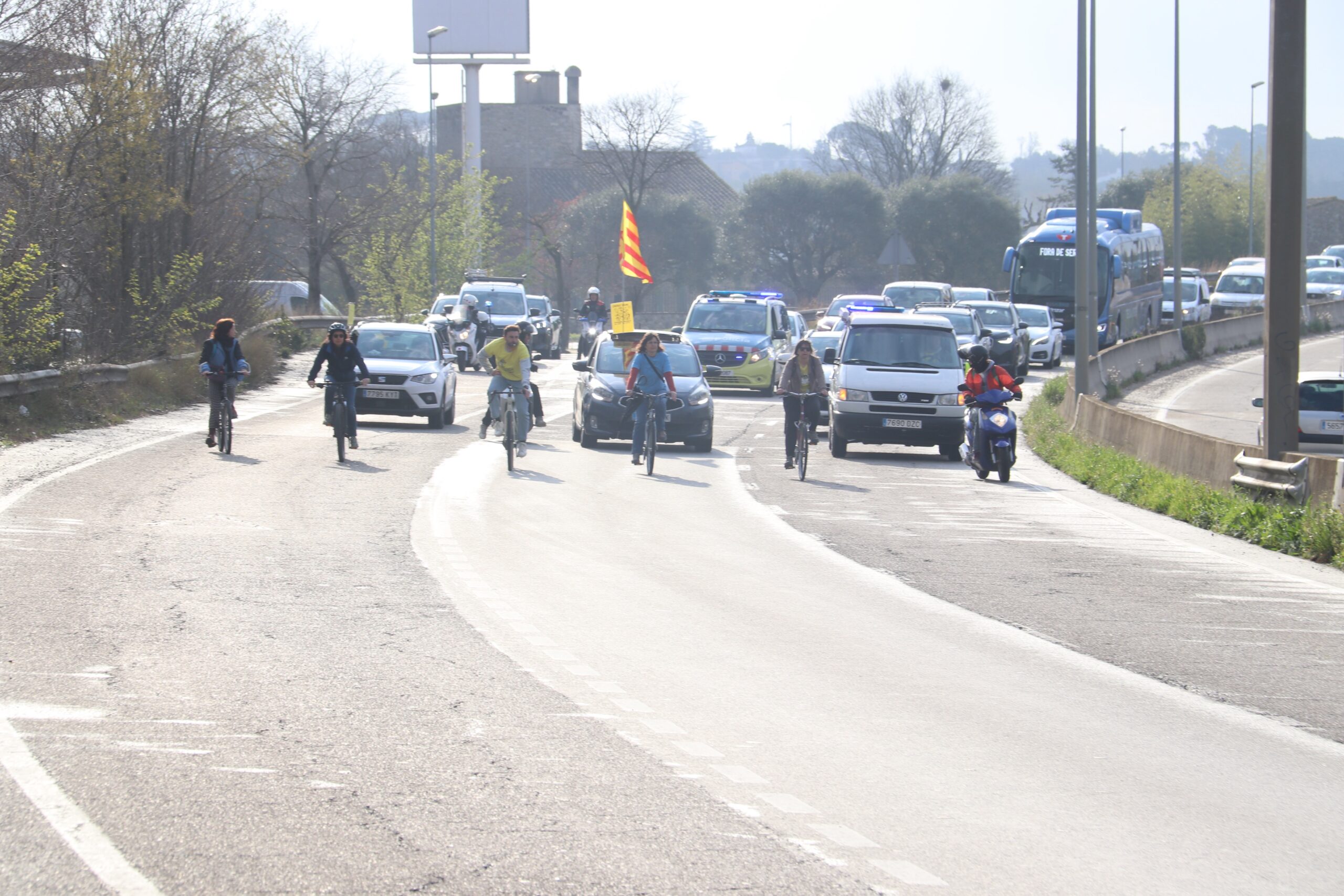 Quatre bicicletes han liderat aquesta marxa equipades amb pancartes reivindicatives. Tot darrere les seguien els cotxes que anaven a una velocitat molt reduïda. La protesta s’ha fet coincidint amb una de les hores més punta d’entrada a la ciutat en un dels accessos més crítics. Habitualment ja hi ha nombroses retencions en aquest accés de l’autopista a Salt en direcció a Girona.