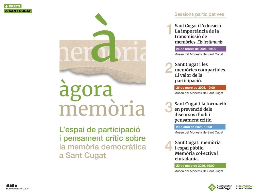 L’Ajuntament de Sant Cugat inicia el projecte Àgora Memòria, un cicle de xerrades i debats dissenyat per fomentar una reflexió col·lectiva sobre el concepte de memòria i la seva importància per afrontar els reptes socials actuals. Aquest cicle neix com a resposta a l’augment dels discursos d’odi, tant a nivell global com local.
